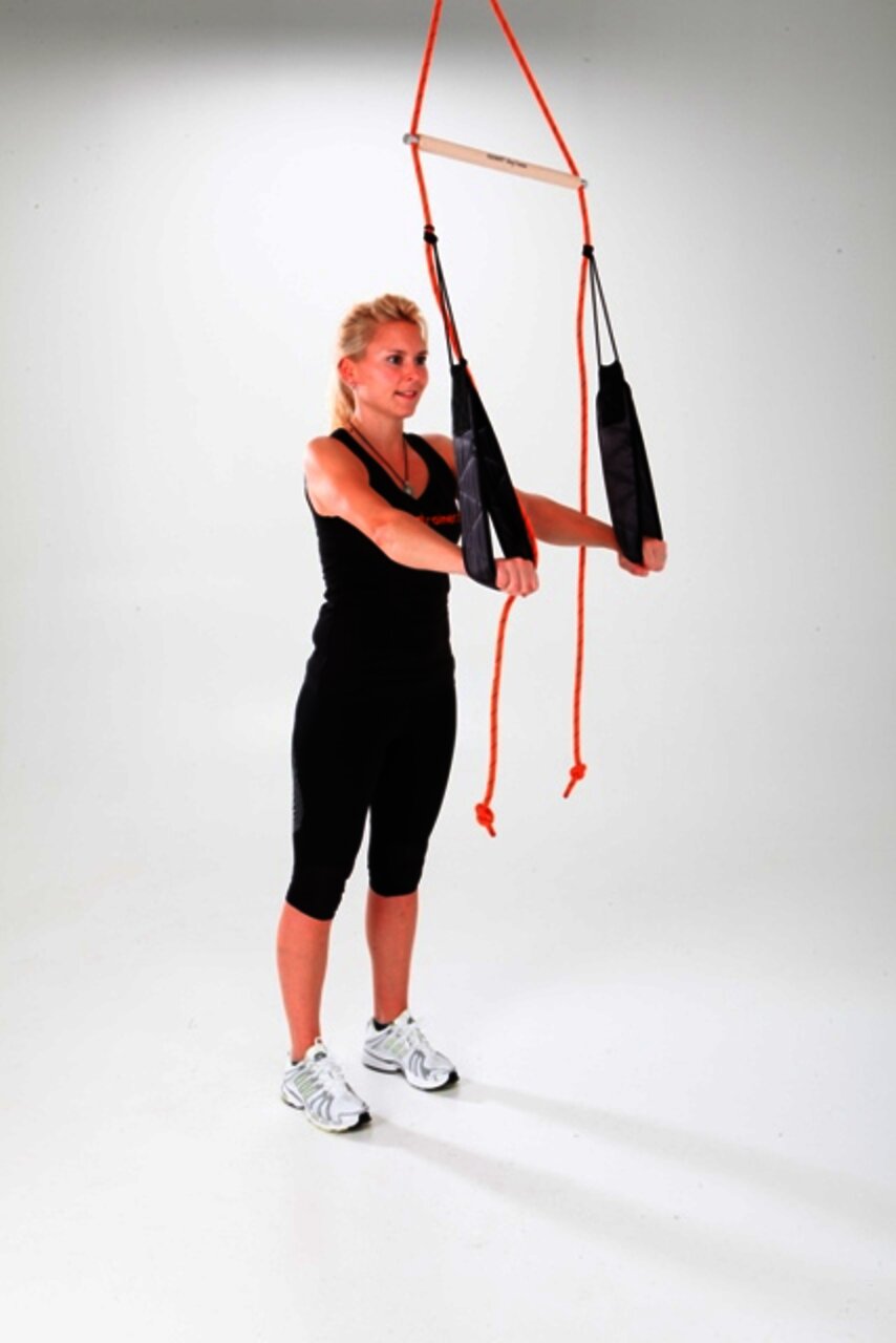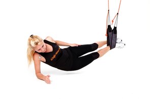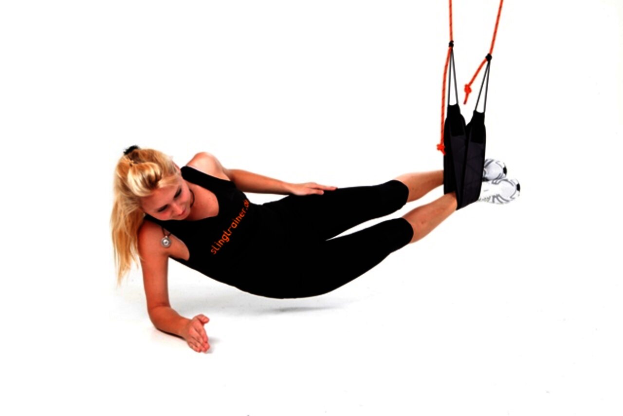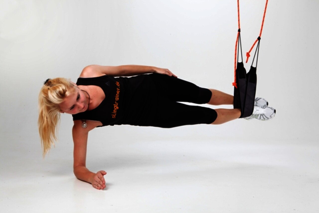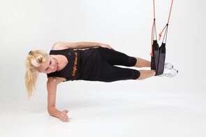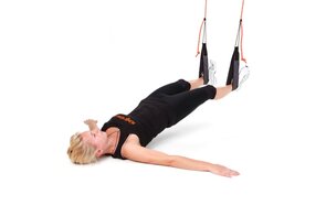 - Füße in die Schlingen, Bauch und Gesäß anspannen, Gesäß abheben
